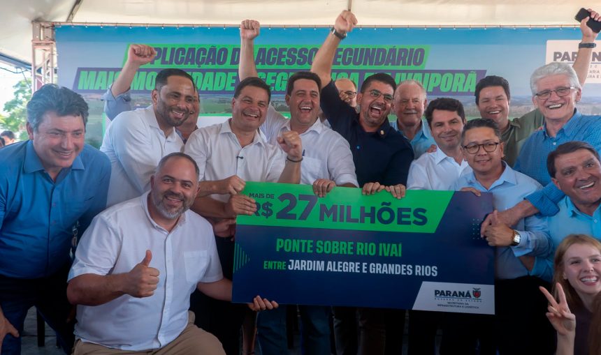 O governador Carlos Massa Ratinho Junior assinou nesta quinta-feira (27) um convênio com a Prefeitura de Jardim Alegre para a construção de uma nova ponte de concreto sobre o Rio Ivaí, ligando o município a Grandes Rios. O Estado poderá investir até R$ 27,8 milhões na obra, que terá cerca de 250 metros e criará um novo corredor rodoviário no Vale do Ivaí.