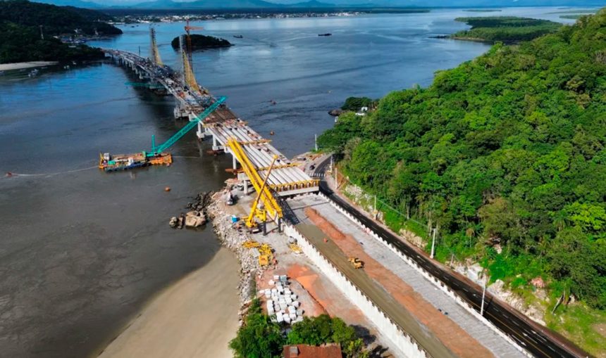A instalação dos estais, cabos de aço responsáveis pela sustentação do vão central, também avançou, com 11 pares já fixados em cada um dos mastros dos apoios 4 e 5. No trecho pré-moldado, foi finalizado o lançamento das 160 vigas longarinas previstas em projeto.