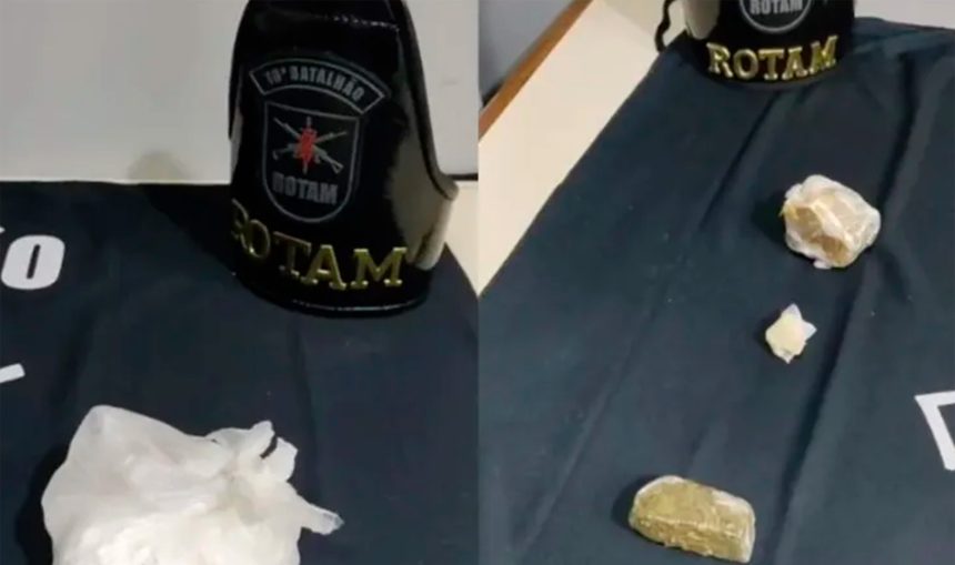 Na sequência, os policiais localizaram dois homens escondidos no quarto de uma edícula nos fundos da residência ao lado. Durante buscas no local, foi encontrada uma camiseta escondida sob um tambor, contendo 243,5 gramas de cocaína, 106 gramas de crack e 21 gramas de maconha. Dois celulares também foram apreendidos.