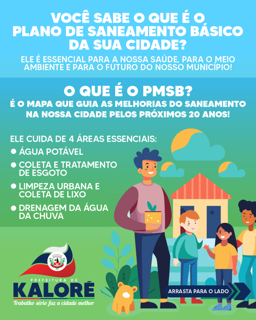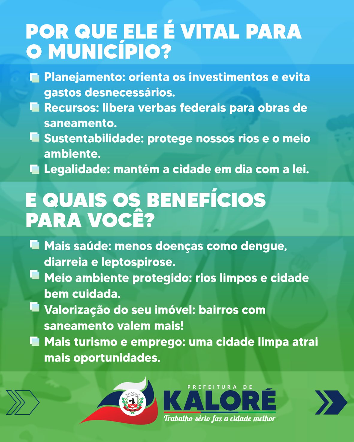 O Plano Municipal de Saneamento Básico (PMSB) é uma ferramenta essencial para orientar as ações e investimentos no setor de saneamento pelos próximos 20 anos em Kaloré. O documento estabelece diretrizes para quatro áreas fundamentais ao bem-estar da população: