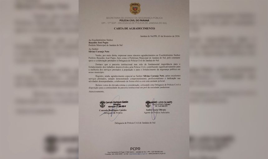 A Delegacia de Polícia Civil de Jandaia do Sul encaminhou uma carta de agradecimento ao prefeito Benedito José Pupio e à Prefeitura Municipal pelo apoio contínuo às atividades da unidade policial.
