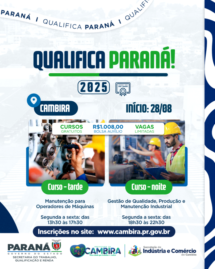 A Prefeitura de Cambira, por meio da Secretaria de Indústria e Comércio, em parceria com o Governo do Estado do Paraná e o programa Qualifica Paraná 2025, deu início às inscrições para dois novos cursos gratuitos de qualificação profissional. As aulas começam no dia 28 de agosto e oferecem uma excelente oportunidade para quem busca se especializar e conquistar espaço no mercado de trabalho.