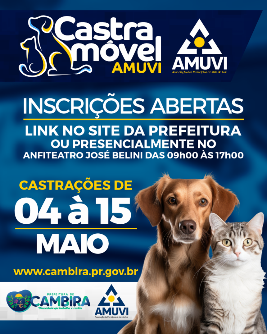 A Prefeitura de Cambira, em parceria com a AMUVI (Associação dos Municípios do Vale do Ivaí), está com inscrições abertas para mais uma etapa do programa Castra Móvel, que realizará castrações gratuitas de cães e gatos no município.