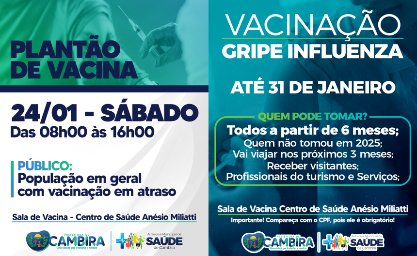 A Prefeitura de Cambira, por meio da Autarquia Municipal de Saúde, segue intensificando a campanha de vacinação contra a gripe Influenza, que está disponível até o dia 31 de janeiro, na Sala de Vacina do Centro de Saúde Anésio Miliatti.