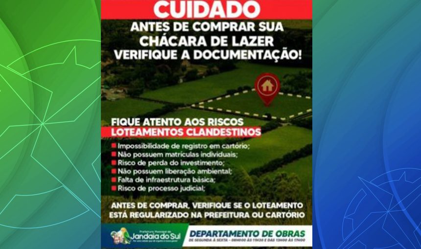 A Prefeitura de Jandaia do Sul, por meio do Departamento de Obras, emitiu um alerta à população para que fique atenta a possíveis golpes envolvendo loteamentos clandestinos. A orientação é clara: antes de fechar qualquer negócio, é fundamental verificar se o loteamento está devidamente regularizado junto à Prefeitura ou registrado em cartório.