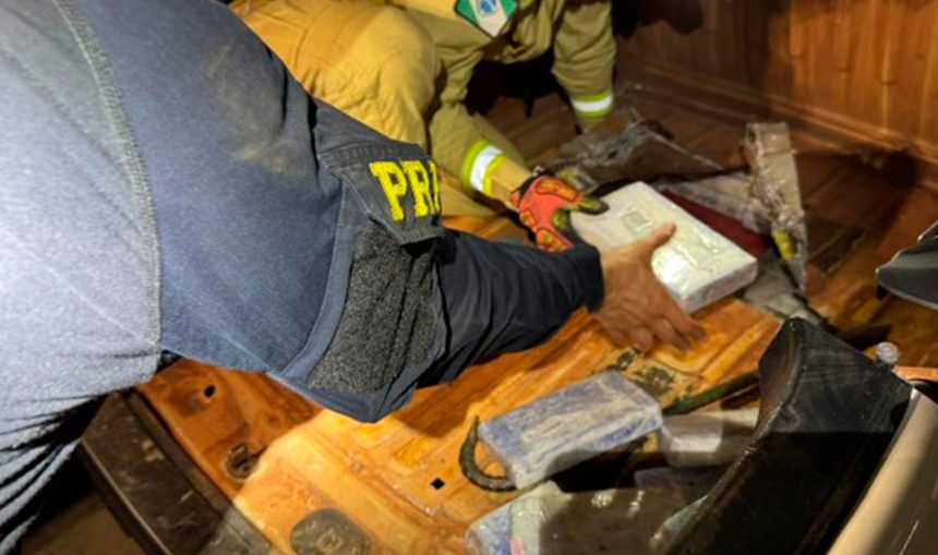 Durante fiscalização em uma Fiat Toro, os agentes identificaram alterações no assoalho. Com apoio do Corpo de Bombeiros, foi aberto compartimento oculto onde estavam 63,32 kg de cocaína e 50,56 kg de pasta base.