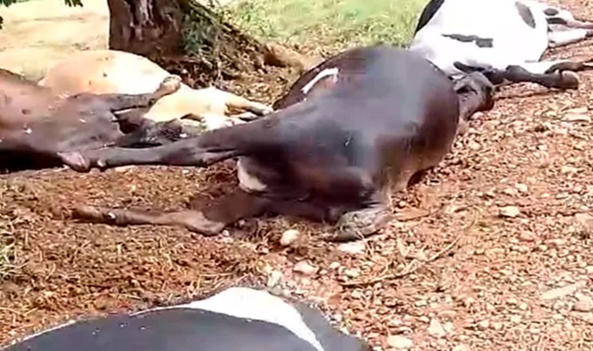 A descarga elétrica provocou a morte imediata de quatro vacas de leite e um boi. O prejuízo foi considerado significativo para os produtores rurais. As imagens registradas por um morador mostram os animais caídos no local após o temporal.