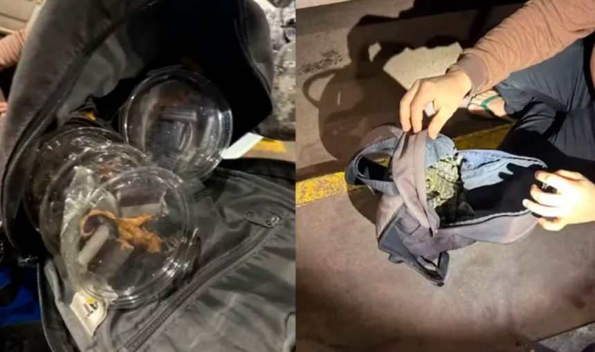 Dentro da mochila de um passageiro de táxi, foram encontrados 12 jacarés, 10 lagartixas de crista, uma sucuri e uma píton filhote. Todos os animais estavam vivos, acondicionados em potes plásticos e sacos de pano.