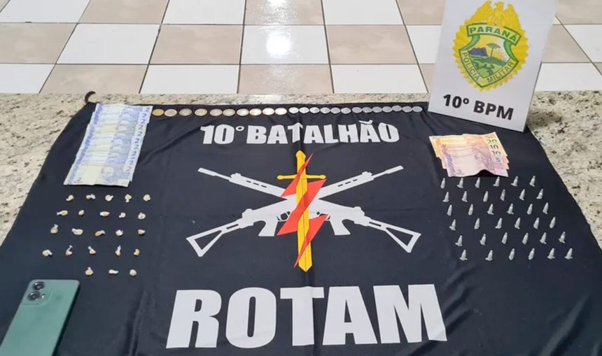 Na busca pelo imóvel, a equipe localizou R$ 132,75 em notas trocadas, além de 23 pedras de crack e 34 pinos de cocaína escondidos no telhado da edícula. O suspeito de 20 anos, já conhecido da polícia, admitiu ter jogado as drogas ao perceber a chegada da viatura.