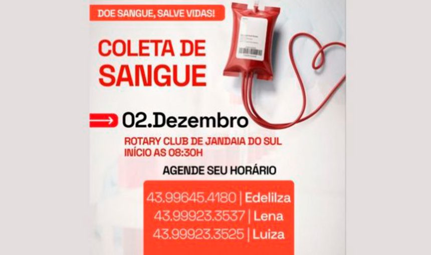 O Rotary Club de Jandaia do Sul realizará uma campanha de doação de sangue no dia 2 de dezembro, a partir das 8h30, na sede da entidade, em parceria com o Hemepar e apoio da prefeitura.