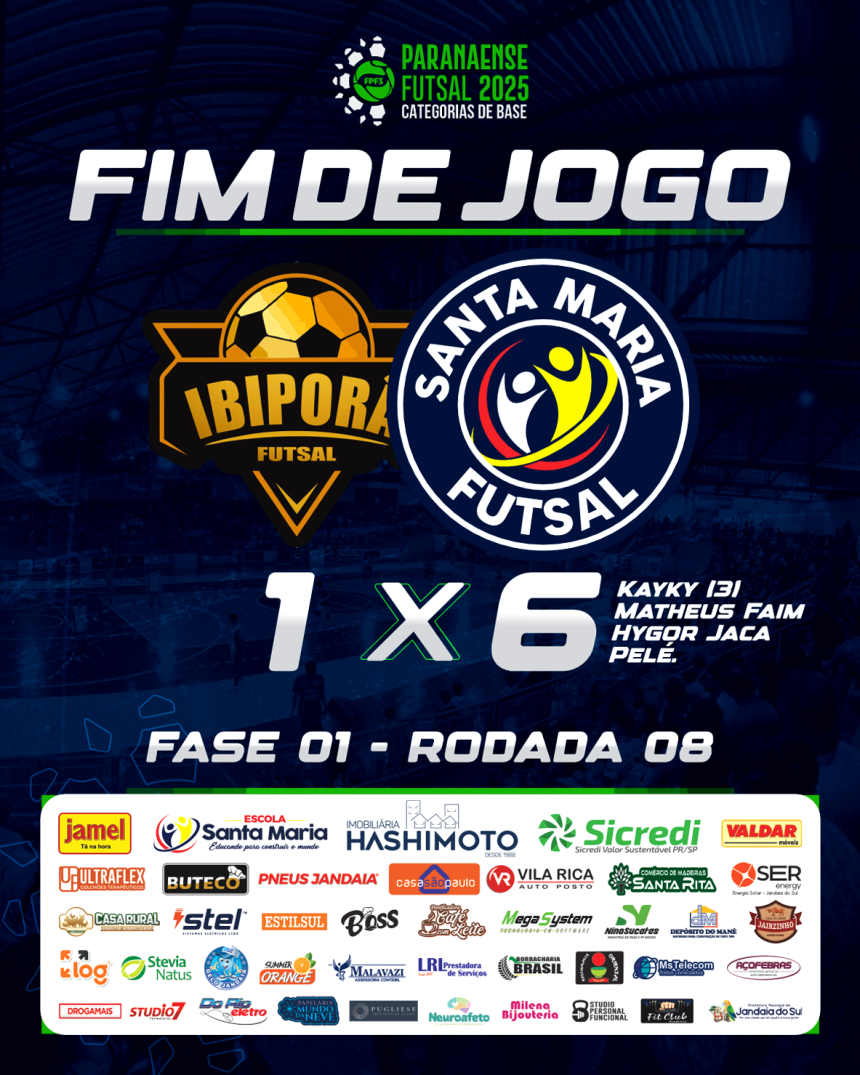 O Santa Maria Futsal conquistou uma vitória maiúscula na noite desta quinta-feira (11), ao golear o Ibiporã Futsal fora de casa em jogo válido pela 8ª rodada da 1ª fase do Grupo A do Paranaense de Futsal 2025 – Categorias de Base.