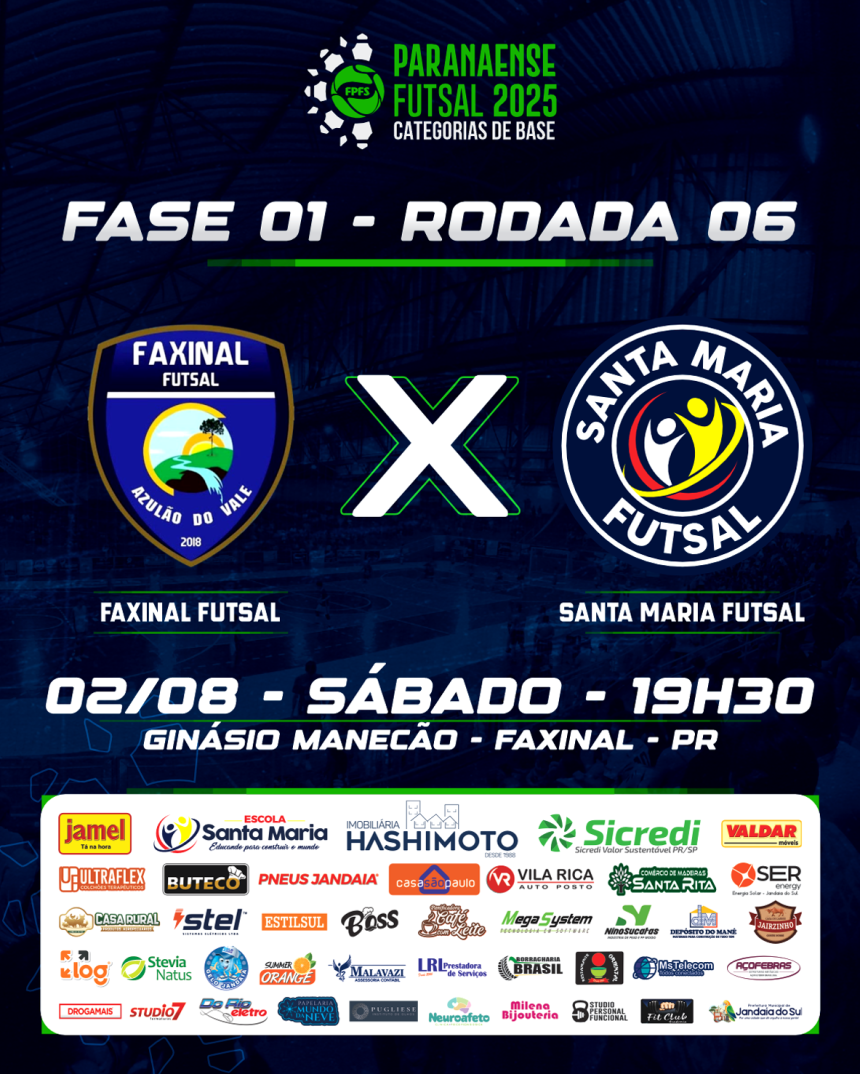 O Santa Maria Futsal tem mais um grande desafio pela frente! Neste sábado, 02 de agosto, a equipe viaja até a cidade de Faxinal (PR) para encarar o Faxinal Futsal em confronto válido pela 6ª rodada da Fase 01 do Campeonato Paranaense de Futsal 2025 – Categorias de Base.