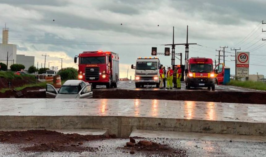 Um veículo Fiat Siena caiu na obra da trincheira que liga a área urbana de Mandaguari à Estrada Alegre na tarde do dia 12, durante um período de forte chuva no município.
