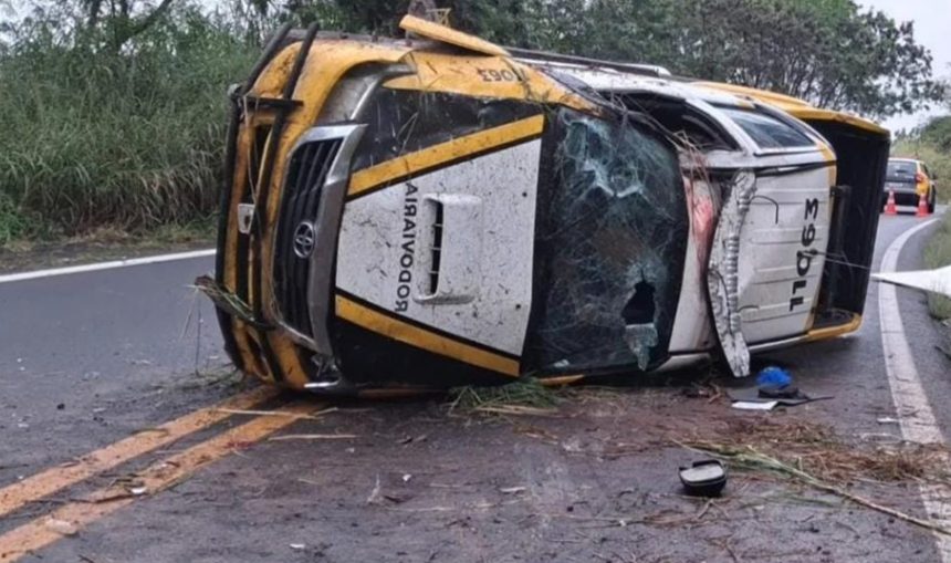 Um policial, de 40 anos, ficou ferido. O PRE contou aos socorristas que capotou a viatura quando tentou desviar de um caminhão que invadiu a contramão. Ele estava indo para Arapongas.