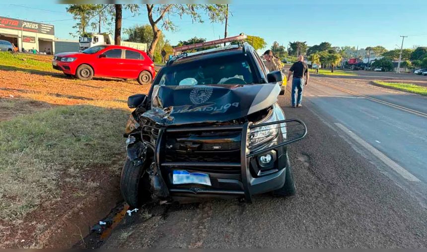 Uma viatura da Rotam, pertencente à 6ª Companhia Independente de Polícia Militar (6ª CIPM), se envolveu em um acidente no final da tarde de segunda-feira (10) no trevo de acesso secundário a Jardim Alegre, na PR-466, em frente ao Supermercado Suprema.
