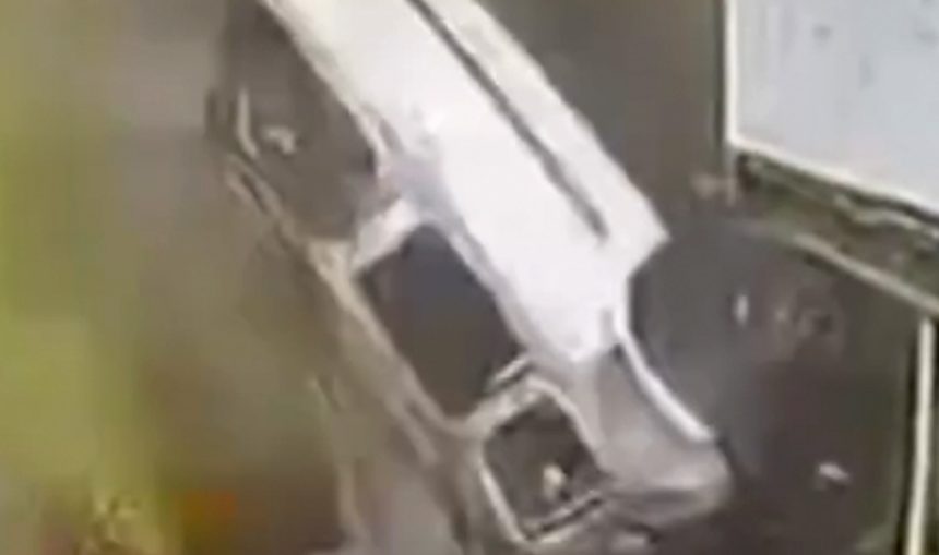Imagens de uma câmera de segurança mostram o momento em que os dois passam entre carros estacionados. Cerca de 25 segundos depois, um dos veículos é atingido por estilhaços e lançado ao ar com a explosão.