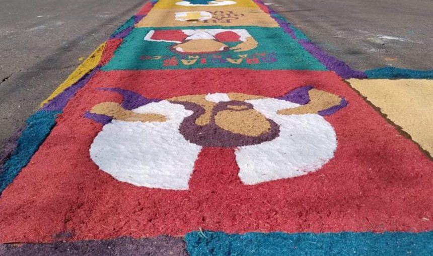 Com cerca de dois mil metros de extensão, o trajeto foi cuidadosamente ornamentado com materiais naturais e recicláveis, como serragem colorida, pó de café, sal grosso e cascas de ovo. Os primeiros voluntários começaram os trabalhos ainda na madrugada: por volta das 3h30 em frente à Paróquia Nossa Senhora Aparecida e, às 4h15, na Paróquia Bom Pastor.